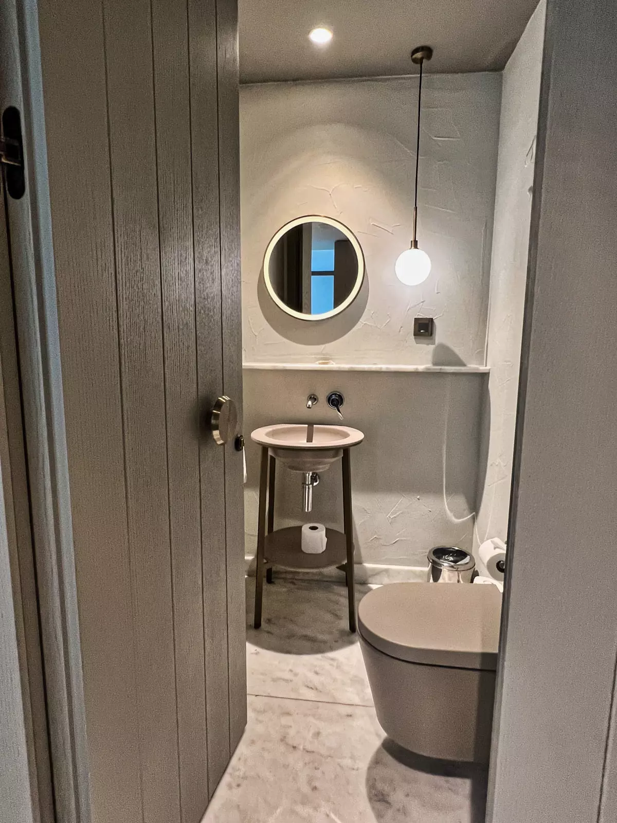Wir übernachten in einem Deluxezimmer im Hauptgebäude, welches eine angenehme Größe hatte und ist mit einem separaten WC und einem Ankleidezimmer ausgestattet. Der Waschtischbereich ist offen zum Zimmer hin gestaltet. An ihn sich anschließend befindet sich die separate Dusche. Absolutes Highlight des Zimmers ist die rund 30 m² große Dachterrasse. Diese ist mit einem Tisch, zwei Liegen, einem Hängesessel und einem großzügigen Whirlpool ausgestattet.